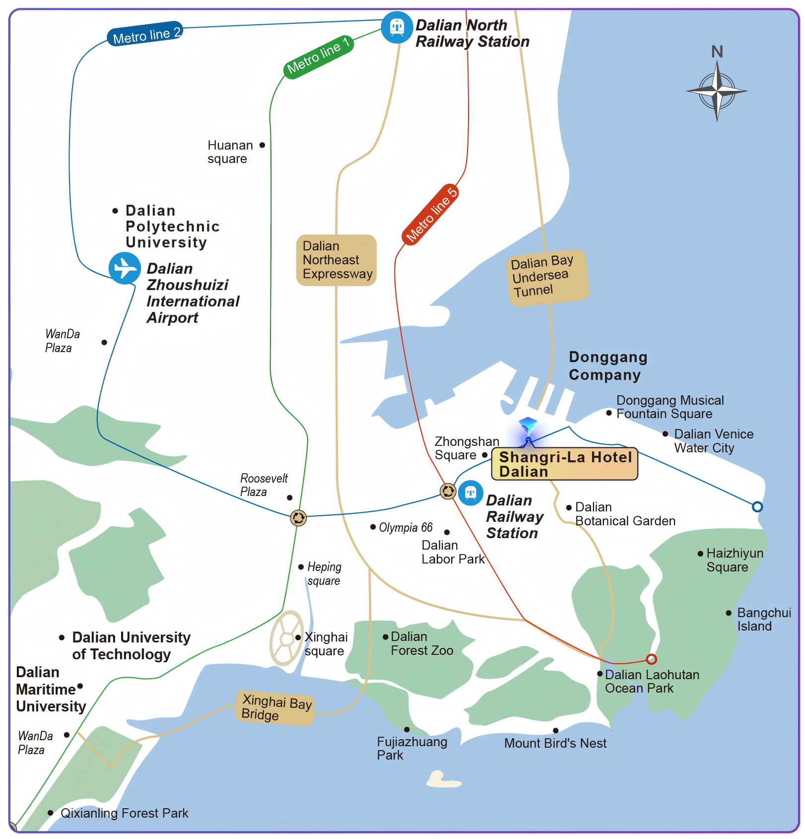 Take the subway: Attendees can take Metro line 2 at the Dalian North Railway Station and get off at Zhongshan Square Station, then walk 900 meters to Shangr-La Dalian.